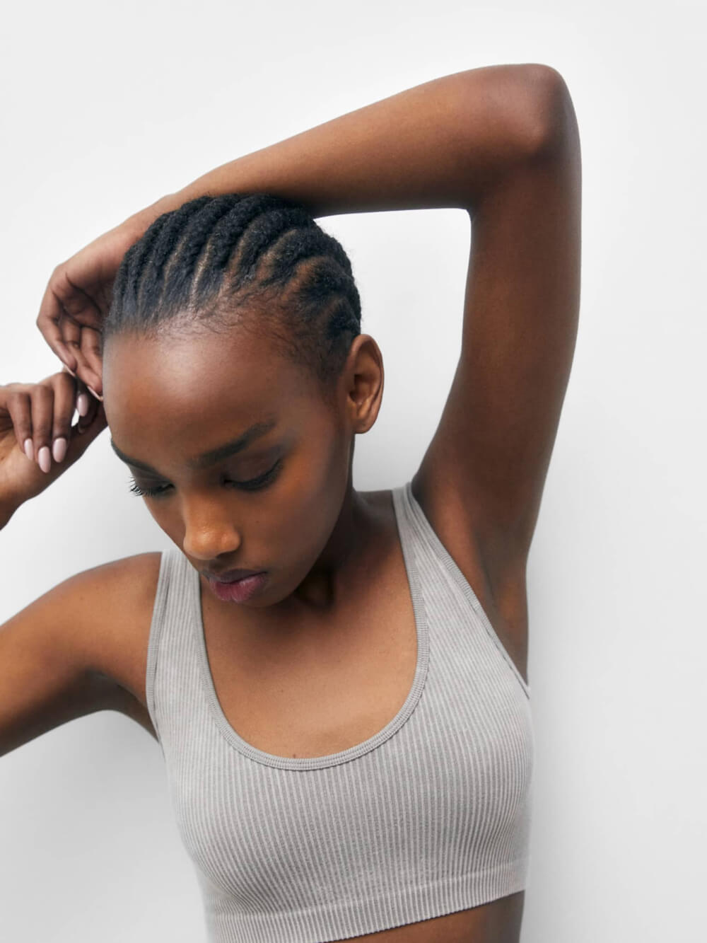 Comfy sleeveless crop top. Made of slightly stretchy faded and ribbed fabric.